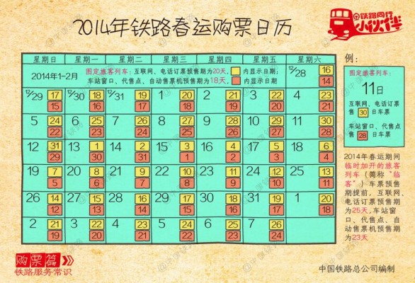 答:從總體上講,2014年鐵路春運火車票的預售期與日?;疖嚻钡念A售期相同。其中,圖定旅客列車互聯網、電話訂票預售期為20天,即2013年12月28日發售2014年1月16日(春運第一天)車票;車站窗口、代售點、自動售票機預售期為18天,即2013年12月30日發售2014年1月16日車票。